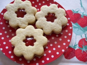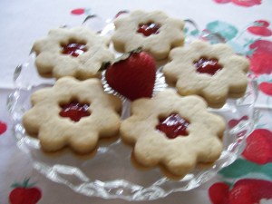 Blue  Cheese does not sit very high on my list of favorite foods;  in fact, honestly, its not on my list at all.  One day, however, I was browsing thru a magazine ( don’t remember which one), when I came across this recipe for Blue Cheese Cookies with Strawberry Jam.  The idea of a strong-flavored “savory” combined with a “sweet” intrigued me, and so I cut out the recipe thinking it would be good for a reception or cocktail party.  It has been simmering on the back burner of my mind for some time, waiting for the right opportunity.  Since this has been a week devoted to berry recipes, I thought it would be a good opportunity to try it out.