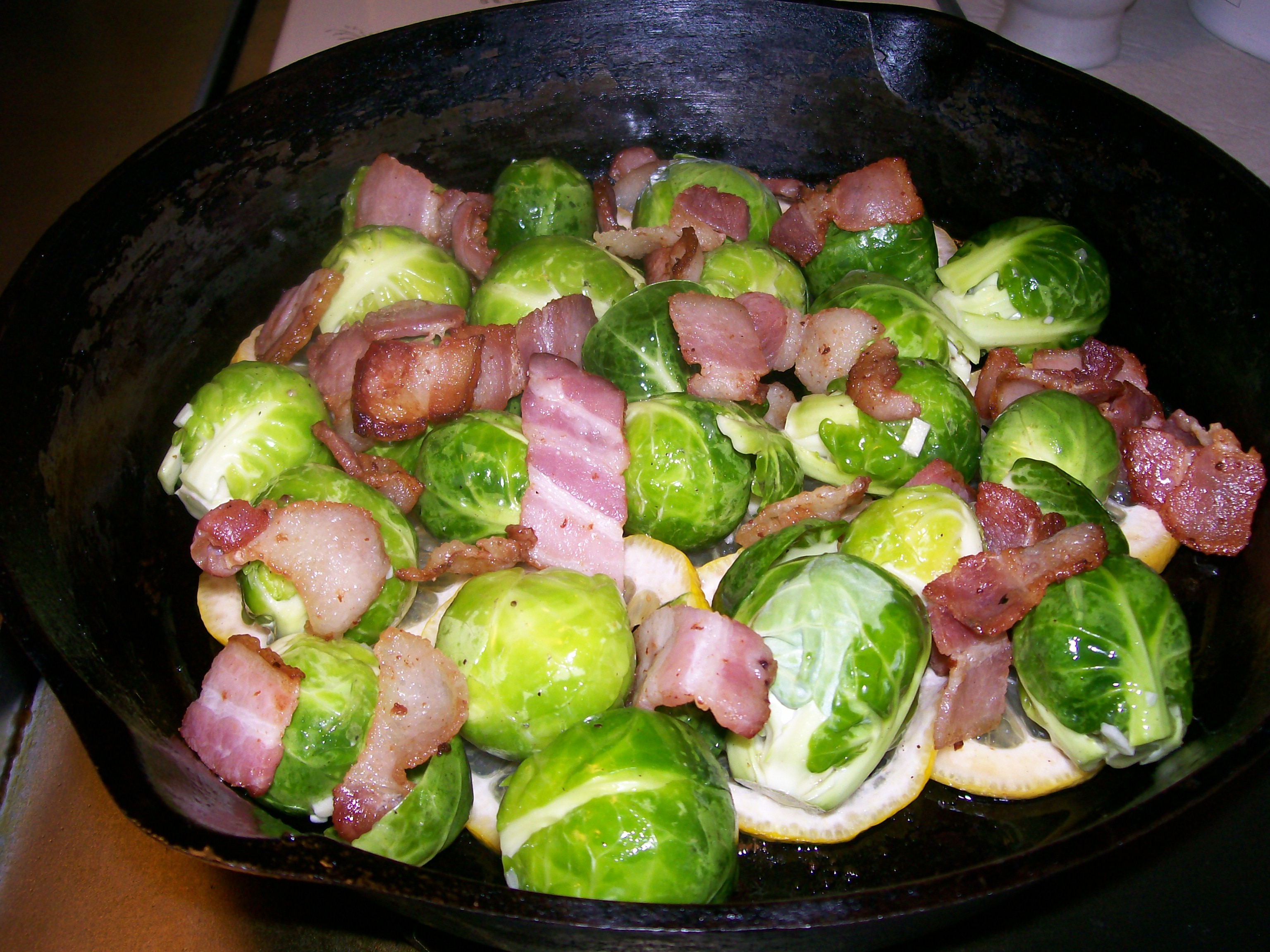 6. Place bacon on top of the Brussels sprouts.