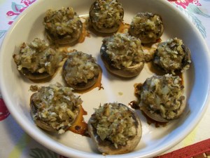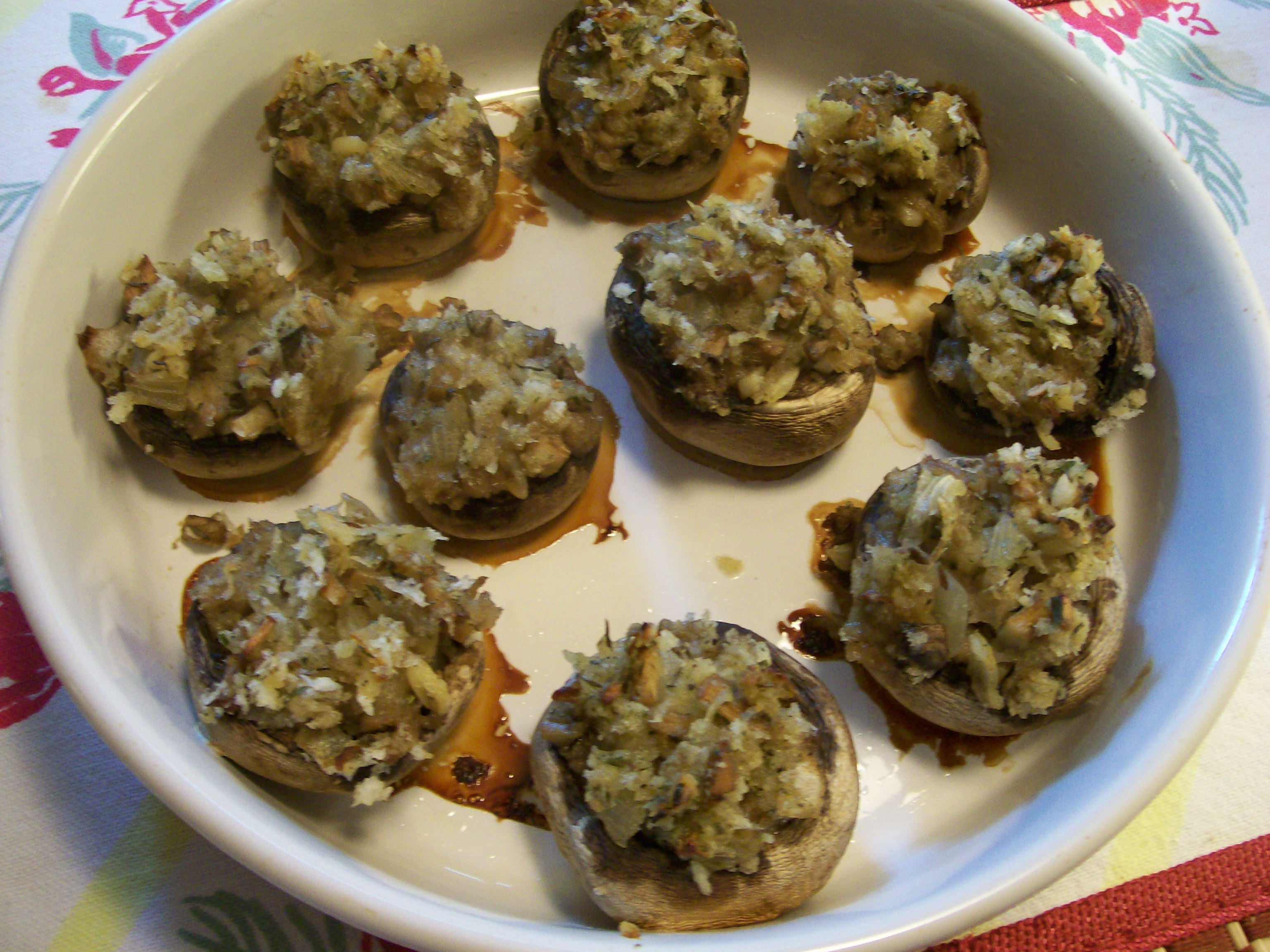 I took the liberty of adding 1/2 cup canned crab meat to the filling for no good reason except that I wanted to. On second thought I think that was a good reason!. For a strictly vegetarian version omit the crab meat. I have made this recipe in the past exactly as written and it is very good, so either way you prepare them I’m sure you will like mushrooms this way.