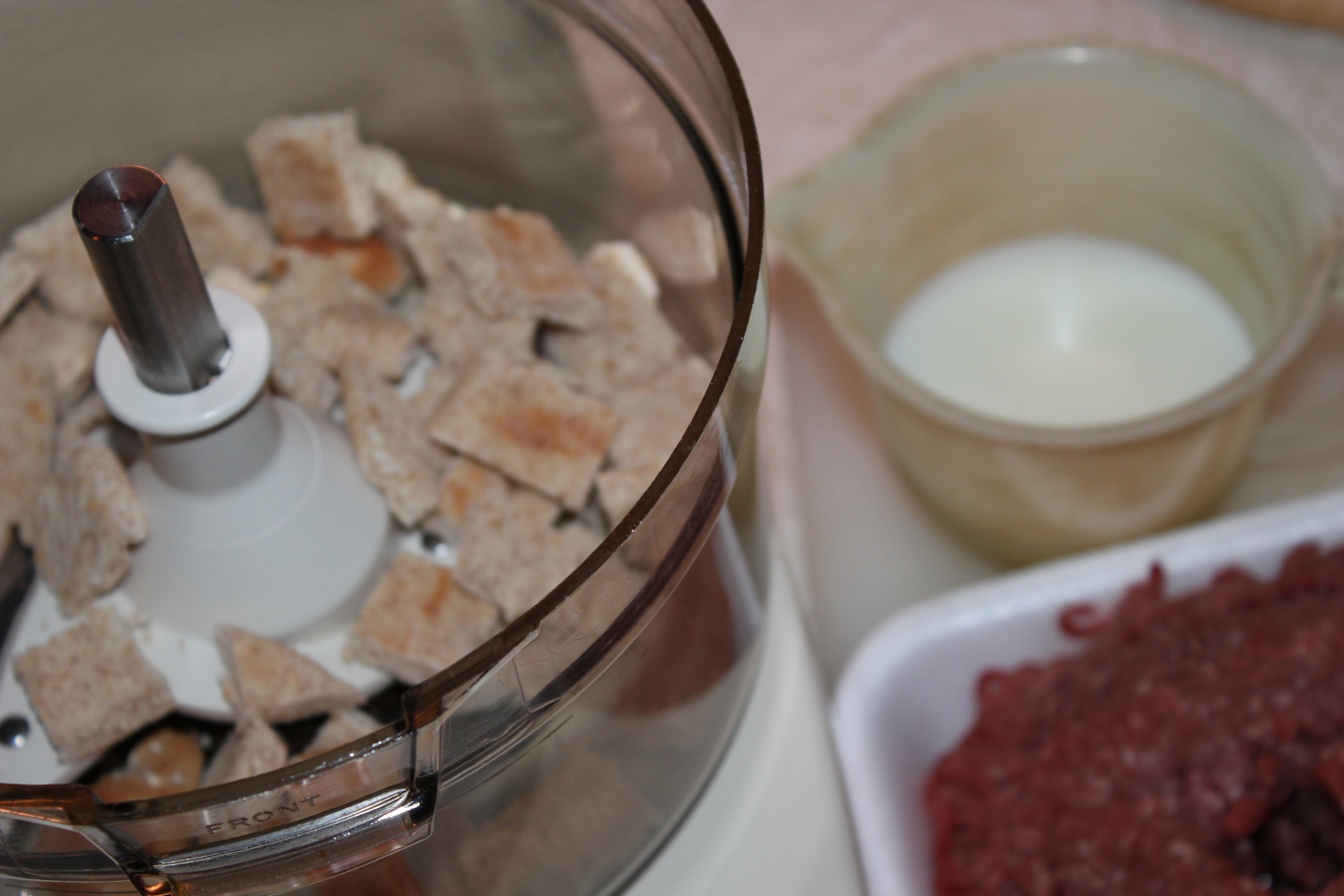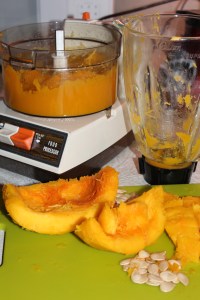 Next step, make the puree. For this I thought I would use my blender ( less parts to wash and put away, says I ). So into the blender container I put about two cups of pumpkin chunks. Turned it on, and nothing much happened. Only the bottom few pieces touching the blades got pureed, the rest just sat there, so I added a little water, but that didn’t help. This is one tough little pumpkin I thought, and the blender just isn’t up to the job. So now I get out the processor, transfer the pumpkin pieces into the work bowl and turn it on.