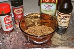 2. Rinse seeds and pat dry. Place in a bowl. Mix together the above ingredients and pour over the seeds. Stir well to coat the seeds.