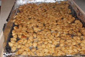 Back to the seeds: I’d often heard or read about toasted pumpkin seeds, and having about 2 cups of them now, I thought I’d give that a try. Handling them carefully I separated the seeds from the stringy stuff, put them into a colander and washed them, then patted them dry with paper towels. Searching on AllRecipes.com, I found this recipe that had a lot of good reviews and suggestions for altering it somewhat for variation.