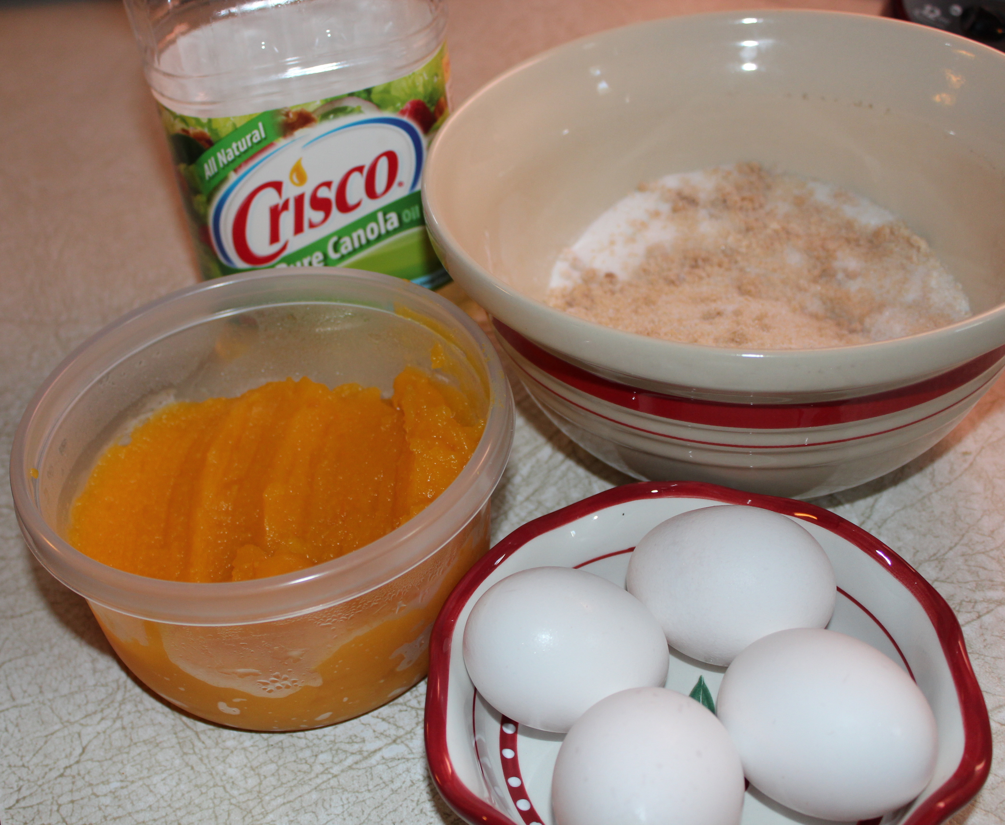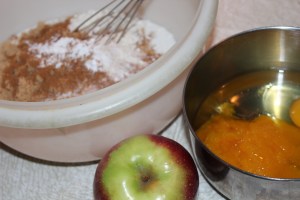 So—now we come to the messy part. I had bought a fresh baby pumpkin with the thought that I would roast it and make my own pumpkin puree. Following the directions of a fellow blogger, I stabbed the pumpkin in the heart and other vital parts and threw him into the oven. I did put him on a baking sheet because somehow I just knew he was going to leak some stuff. After baking for about an hour I checked for doneness, and finding the stab wounds leaking and oozing, I poked him and my finger left a depression, so I surmised he was cooked, and removed the pumpkin from the oven. I then let it cool so I could handle it comfortably.