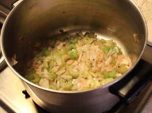2. Add onion, celery and pepper to saucepan. Sauté over medium heat until golden, about 5 minutes. (I didn’t have any peppers so I added some roasted red pepper at the end with the corn).