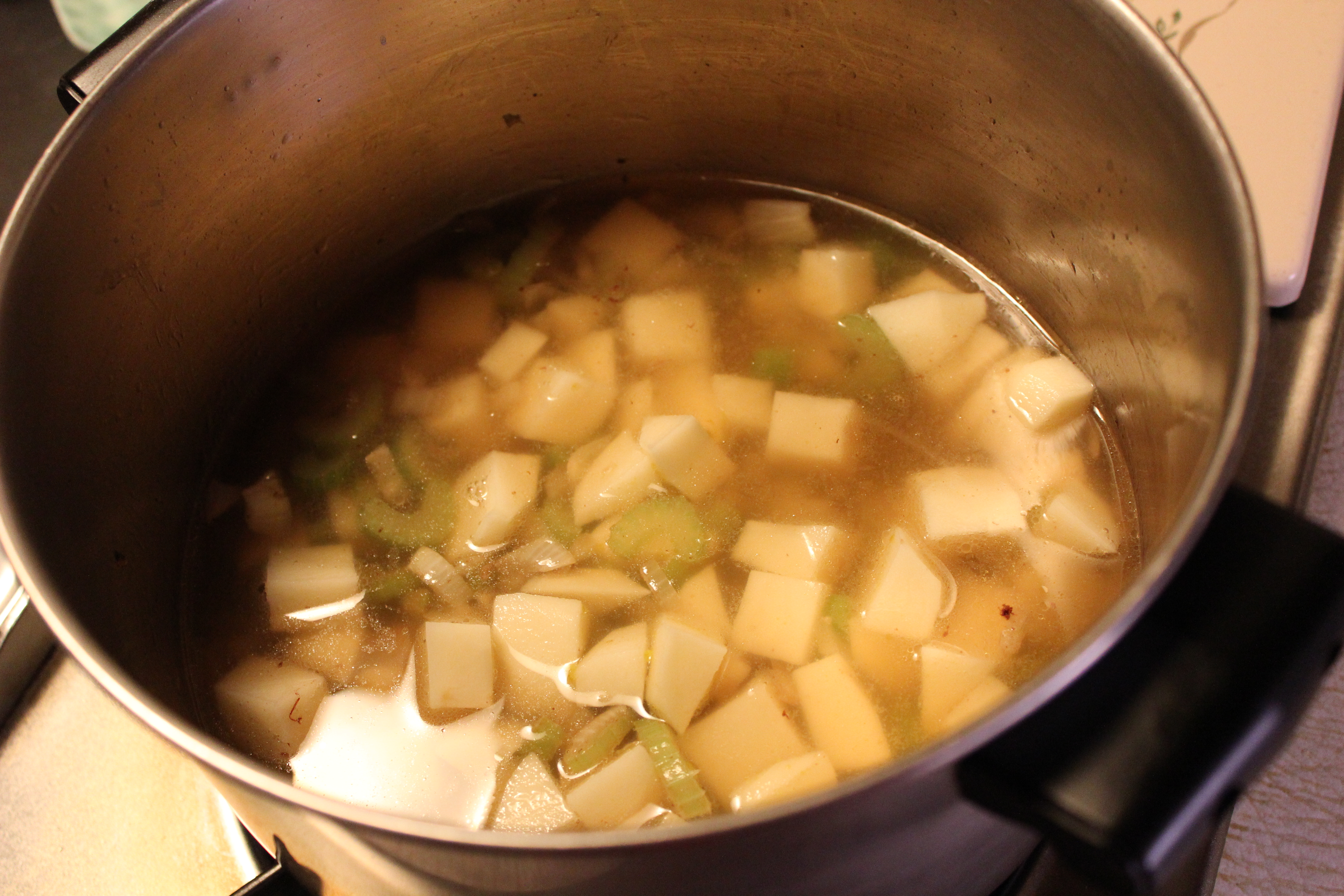 Add broth, water and potatoes, salt, pepper, basil, and bay leaf. Bring to a boil; reduce heat, and simmer covered 10-15 minutes or just until potato is tender.