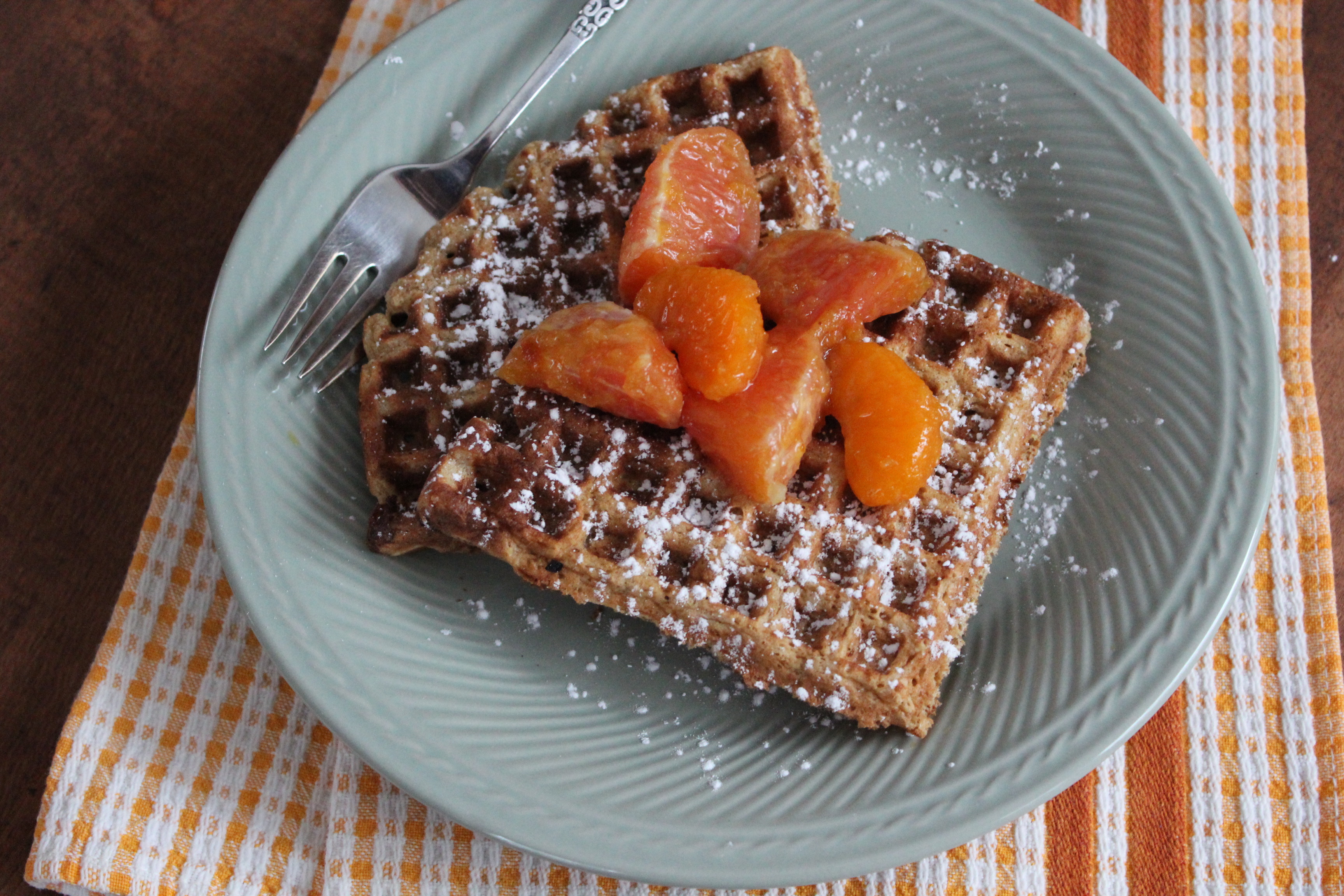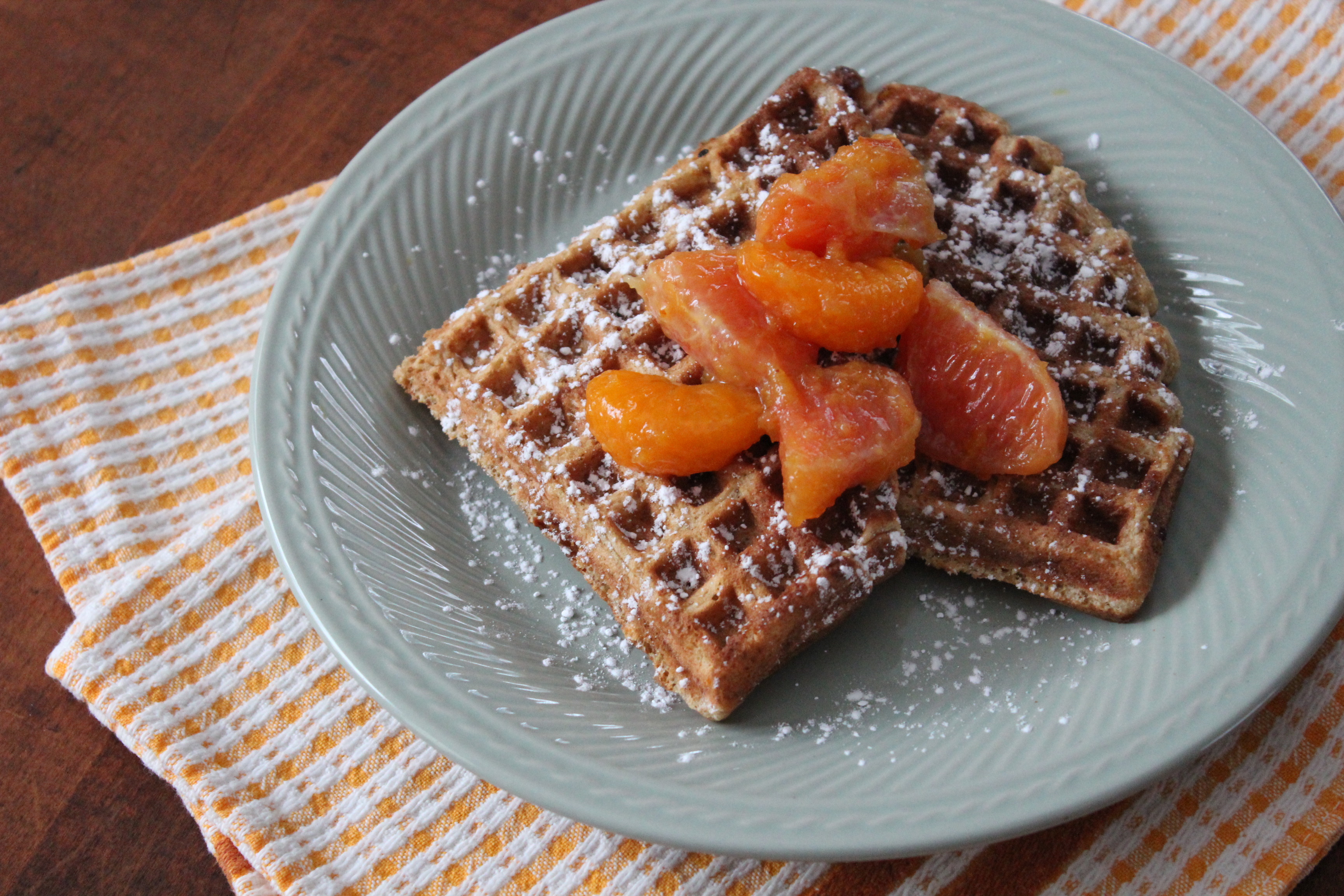 4. Sift powdered sugar over tops of waffles and serve with warm orange compote. Maple syrup tastes really good on them as well!
