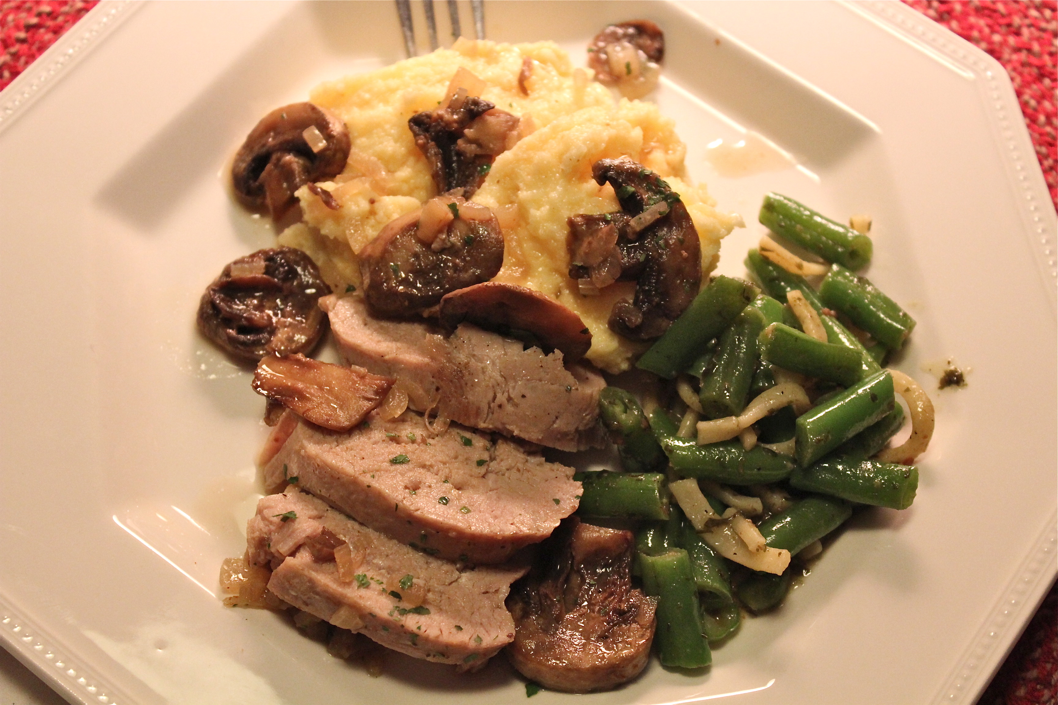 So, with that in mind, I experimented with a pork tenderloin that weighed about a pound. The recipe that follows describes what I did, and I’ll tell you right now that I got the results I wanted: a juicy, tender piece of meat with the added benefit of deep umami flavor thanks to the browning of the meat and the mushrooms used in the sauce. Served with a cheesy polenta to spoon the sauce over, this meal was outstanding. In the words of my husband, it was “plate-licking good”.