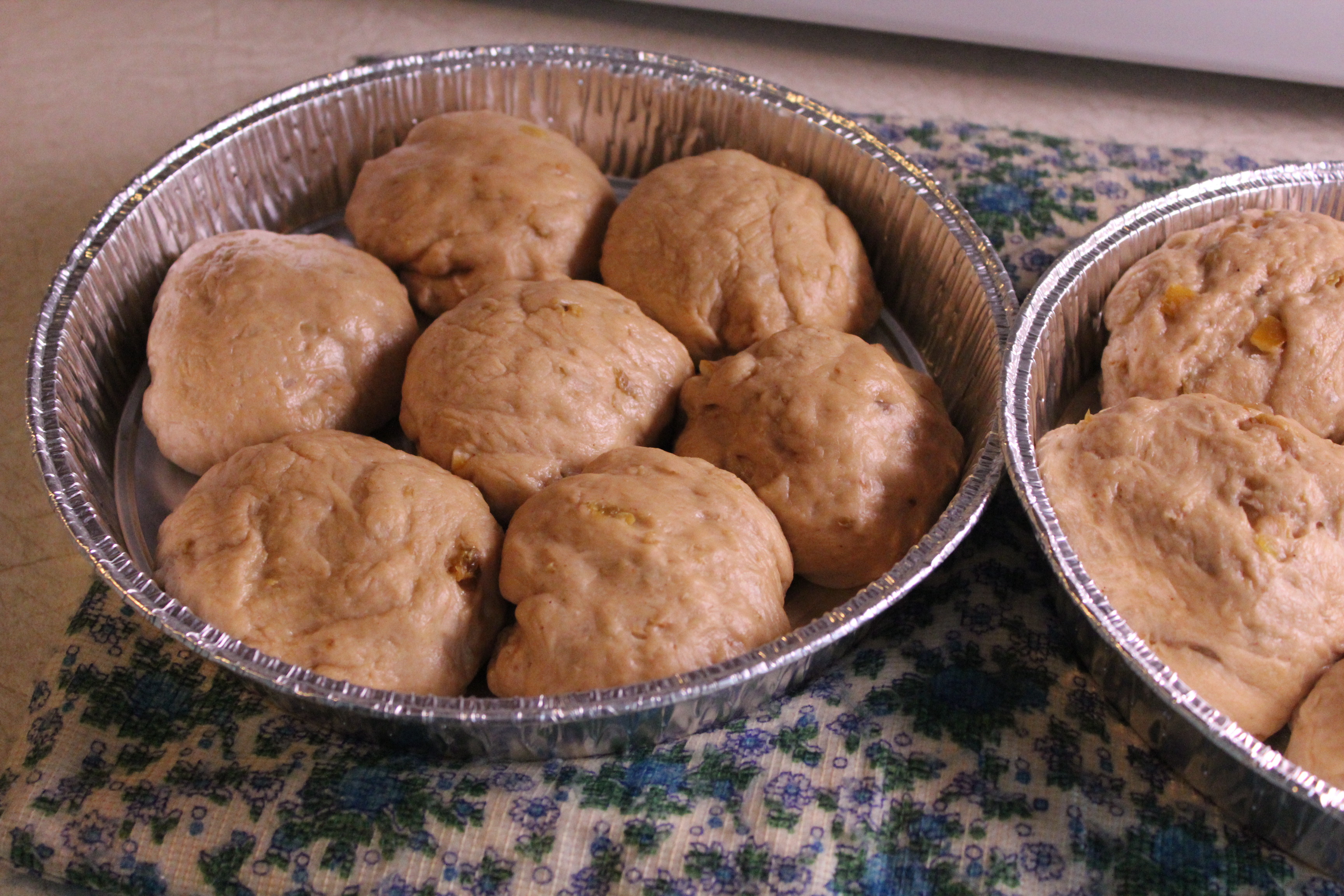 A 1/3 measuring cup or muffin scoop makes about the right portion. You should make about 14 buns. Greasing your hands helps with handling the dough and shaping into balls. Arrange them in greased pans. Suggested pan sizes include 10″ square, 9″ x 13′, or two 9″ round cake pans. The cake pans were a good choice for me allowing for 7 buns in each (see picture), as I gave away one pan of buns.