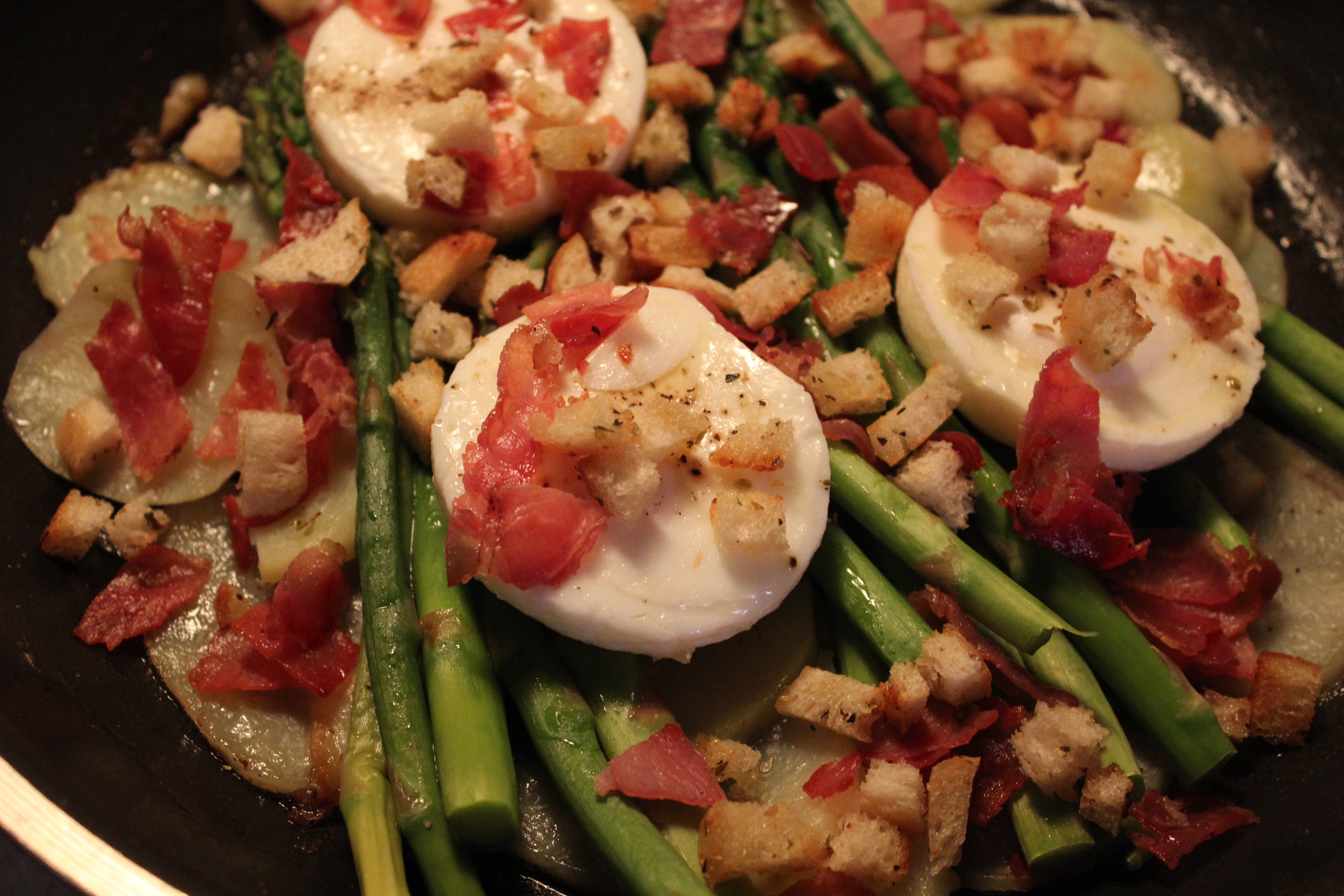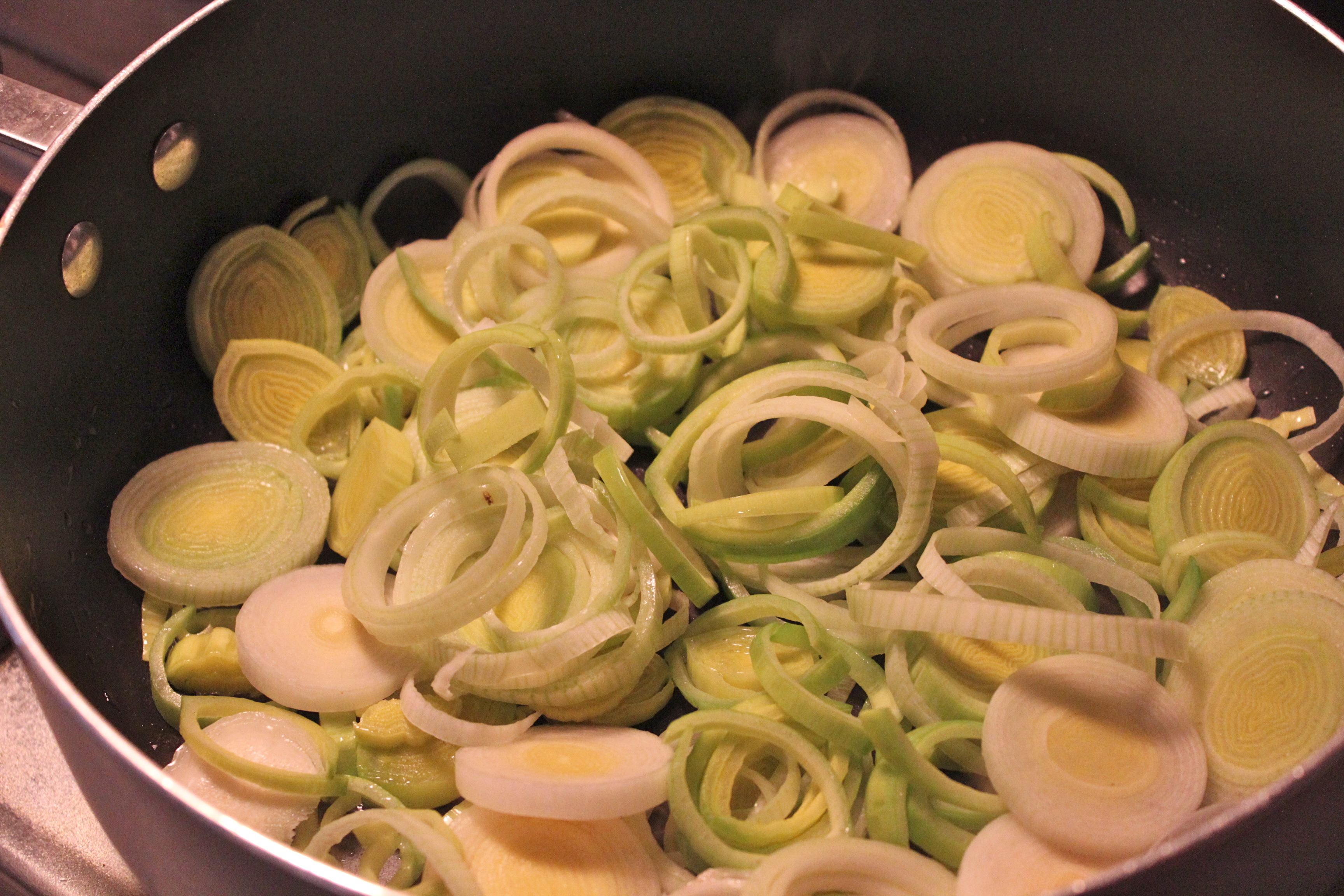 4. While it simmers, core and cup up cabbage. Heat remaining olive oil in another large frying pan or dutch oven; add the cabbage and cook over medium heat until the cabbage is wilted and about half cooked, turning it over several times so it all wilts and cooks. Season with salt and pepper.