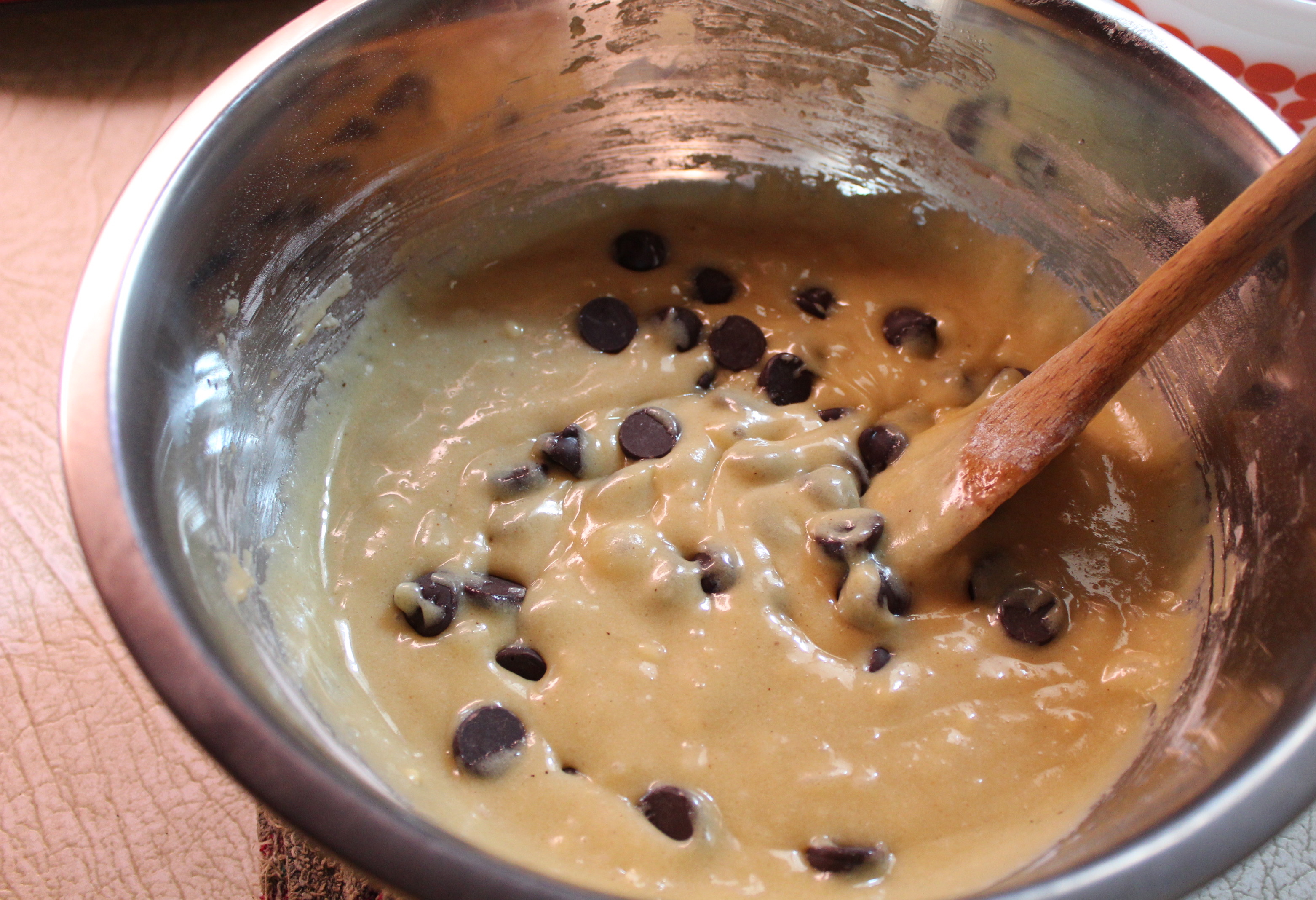 Spoon the batter into a greased 9″ square pan, and sprinkle the remaining chocolate chunks over the top.
