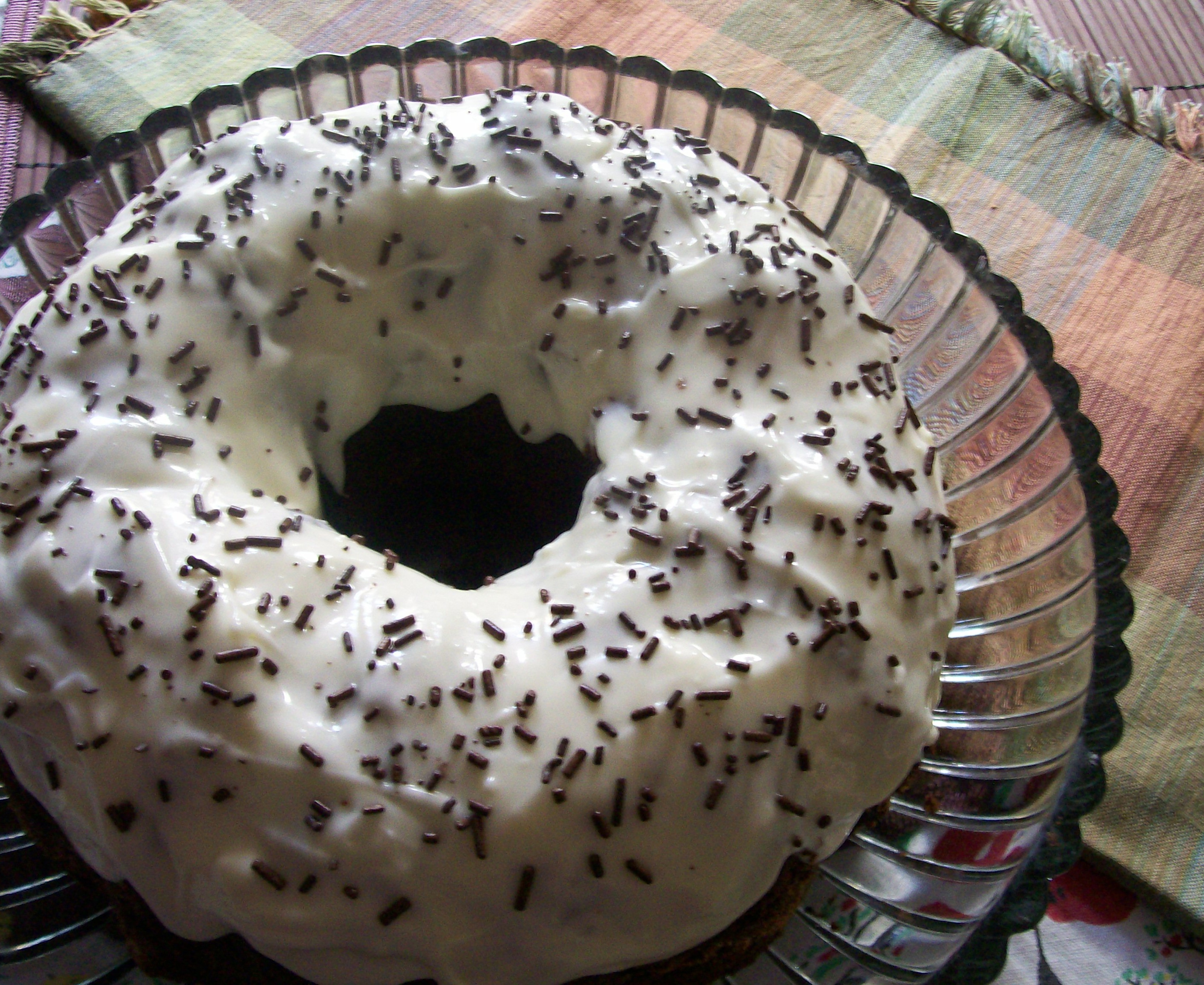 ***This cake is likely to break if you try to remove it from the pan while it is still warm. Ask me how I know! I made a simple frosting of cream cheese, confectionery sugar and milk, in a thin consistency to drizzle over the top. I first used some to glue the cake together where it broke, and then poured the rest over the top and let it run down the sides.