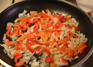 2. Heat a large non-stick skillet over medium heat. Add 4 teaspoons oil; swirl to coat. Add onion; cook for 3 minutes. Add bell pepper; cook 2 minutes.