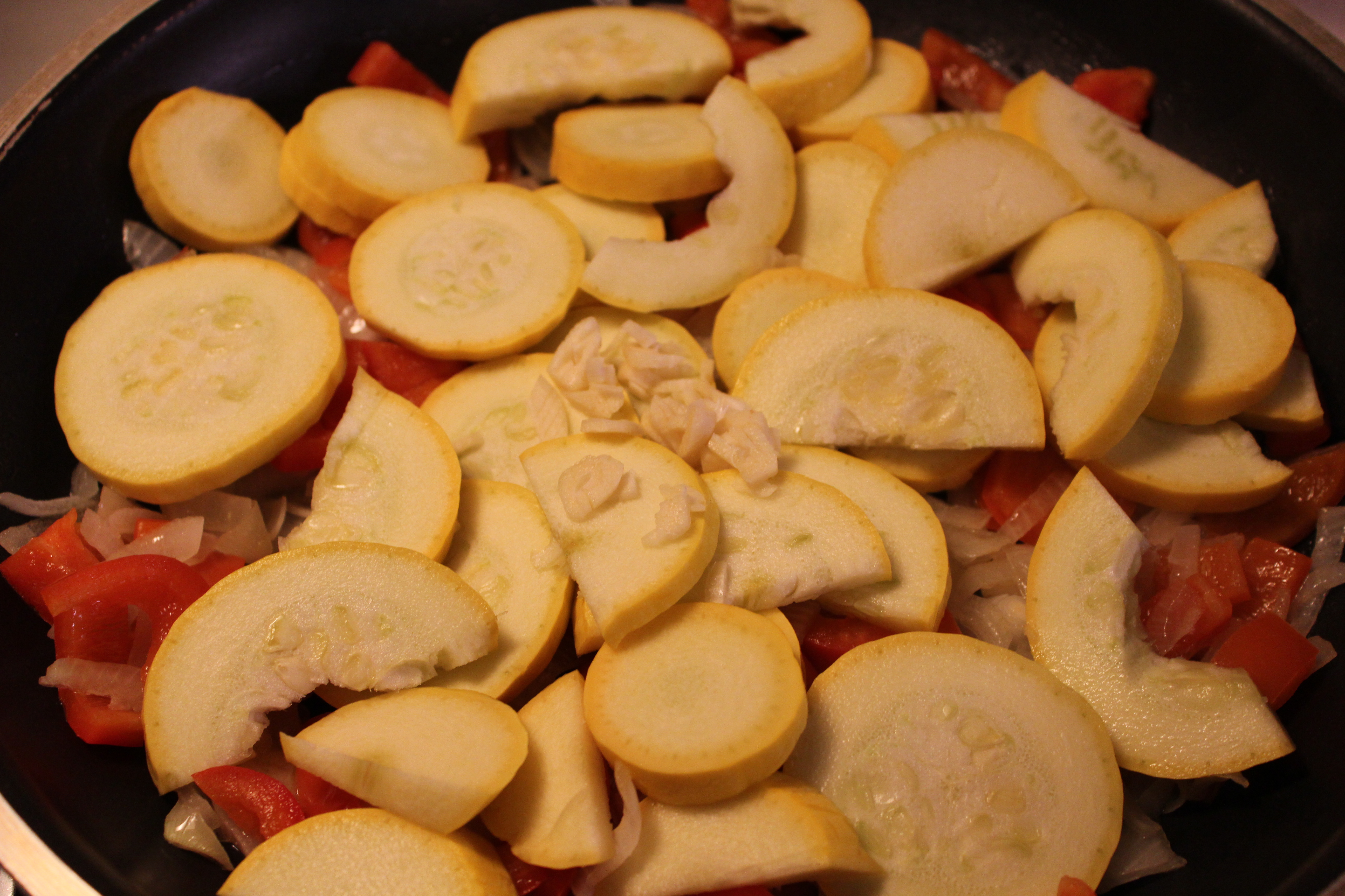 3. Add squash and garlic; cook 4 minutes. Place vegetable mixture in a large bowl.