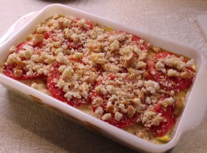 6. Arrange tomatoes evenly over vegetable mixture. Top evenly with crumbs. Bake at 375 degrees for 40 minutes or until topping is browned. Sprinkle with remaining basil before serving.