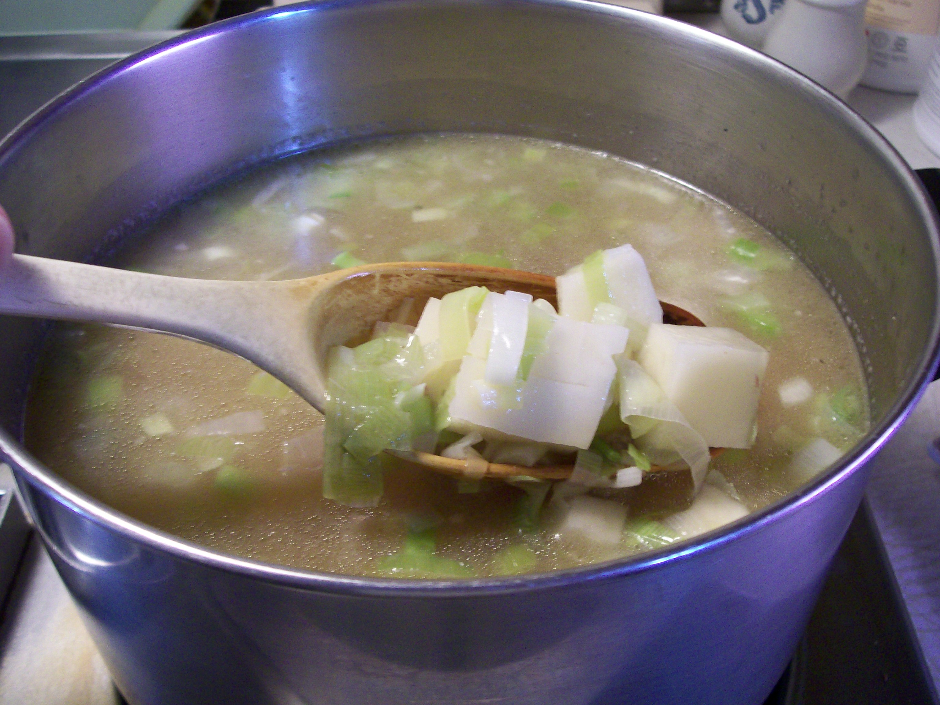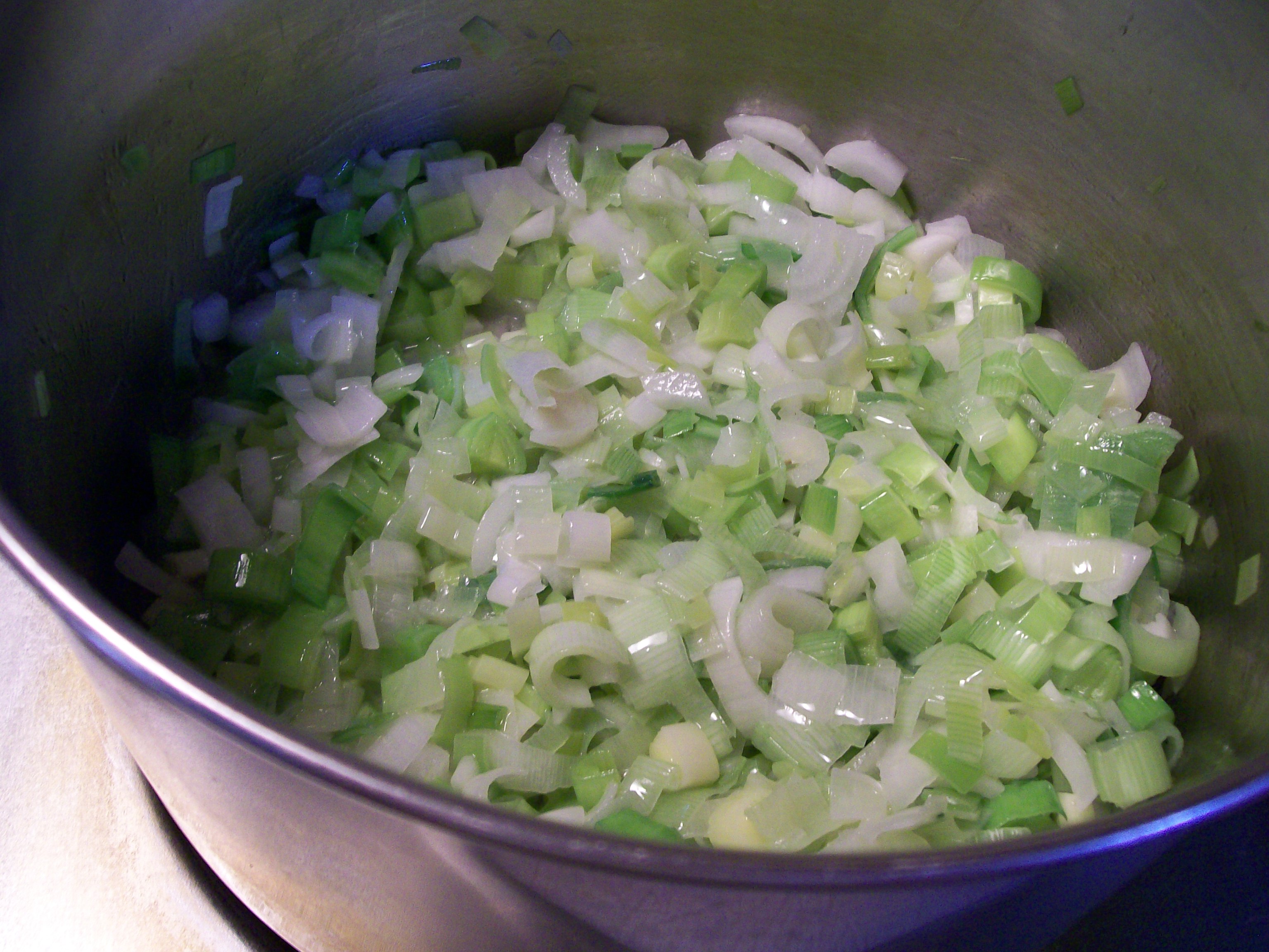 Melt the 4 Tablespoons butter in a soup kettle . Add the leeks and chopped onion. With the heat on low, allow this mixture to “sweat” slowly and become tender. Do not allow it to brown. Meanwhile peel potatoes and cut into small cubes.